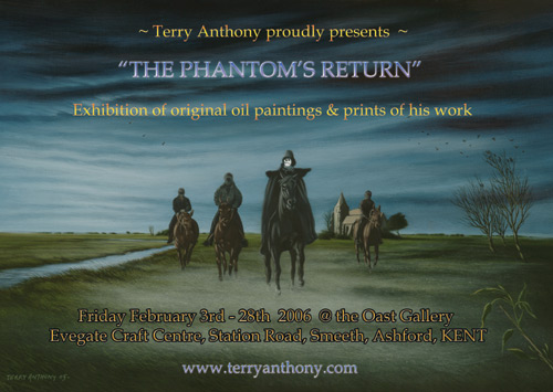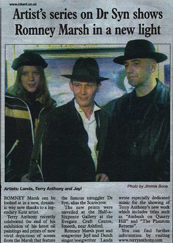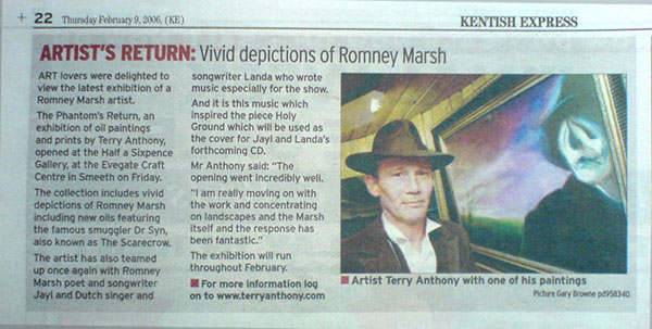 Earlier in 2006, Terry Anthony held an exhibition at the "Half-a-Sixpence" Gallery @ Smeeth, where he presented a collection of wonderful new work. These included the painting depicted above - "The Phantom Returns", which celebrated the 10th anniversary of the release of the original "Marsh Phantom." Terry's music team, Jayl, Jimmie Bone & Dutch Singer/Songwriter Landa were also in attendance and provided the beautiful atmospheric music for the show. In return, Terry presented a new masterpiece inspired and named after Jayl & Landa's song "Holy Ground." This painting will be used as the cover for Jayl's forthcoming album - "The Dance of Life." |
