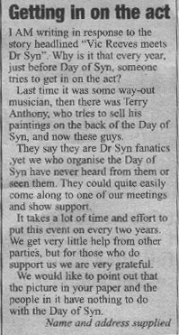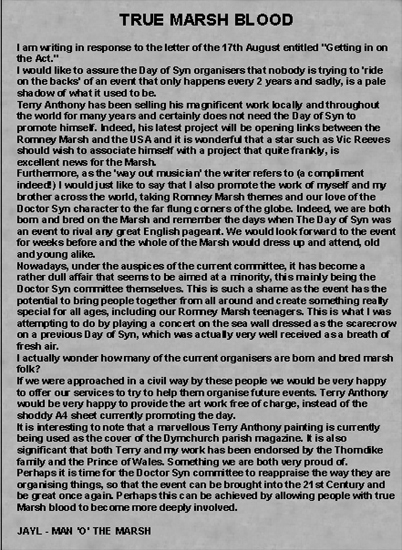 | The following is a letter sent to the Folkestone Herald by the Dr.Syn Society in response to one of the articles above .... Jayl - 'Man 'o' the Marsh' has responded accordingly ... See Below ... | ||||||||||||||||||